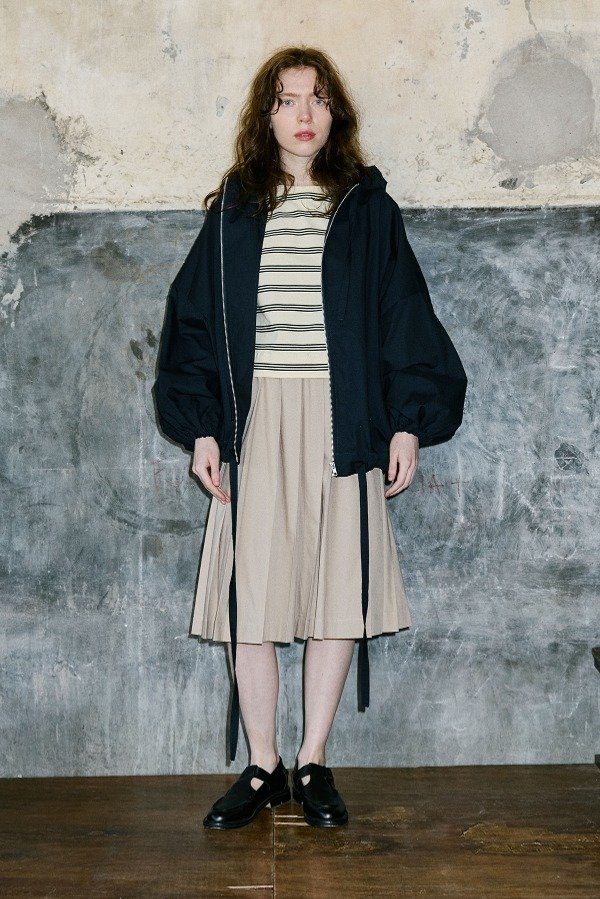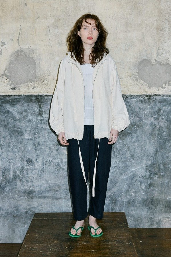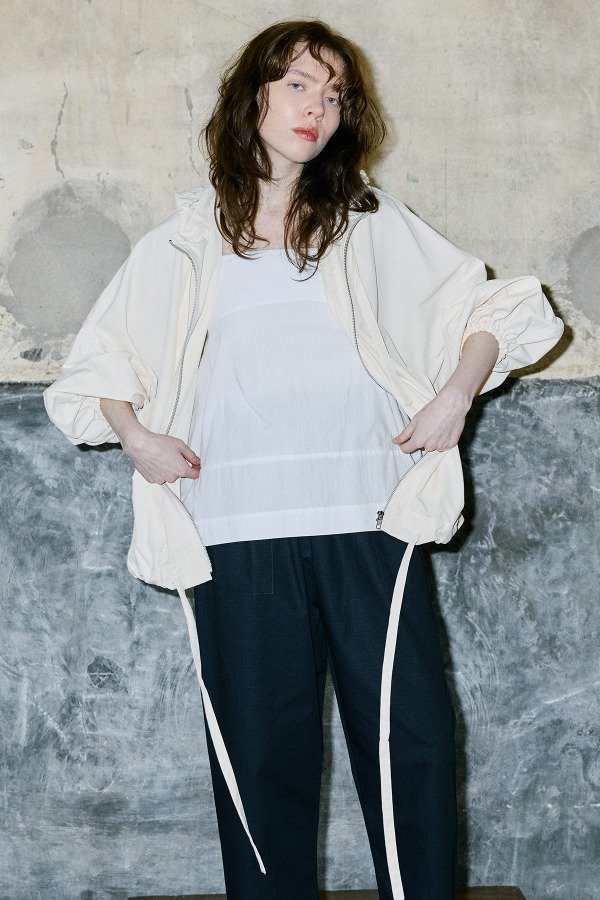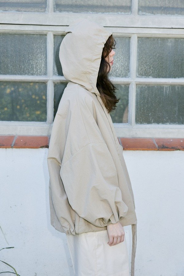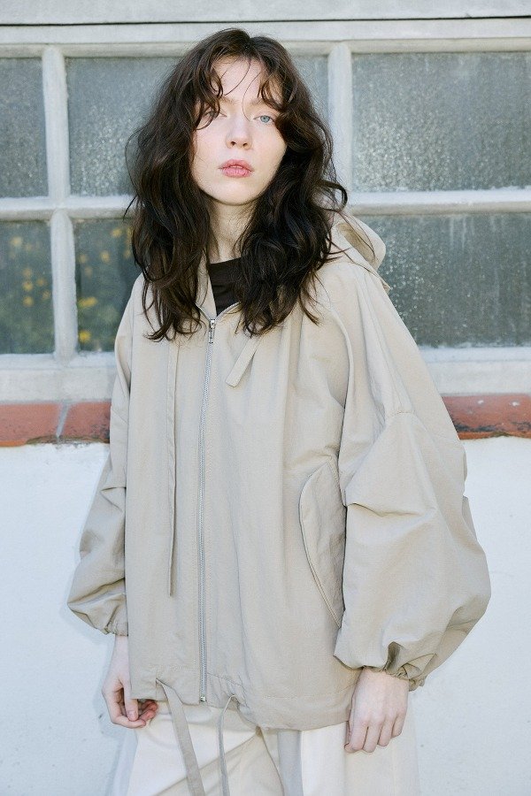 Campera Bombé con cierre de aluminio, capucha con tiras para fruncir, mangas caídas con elástico en el puño,