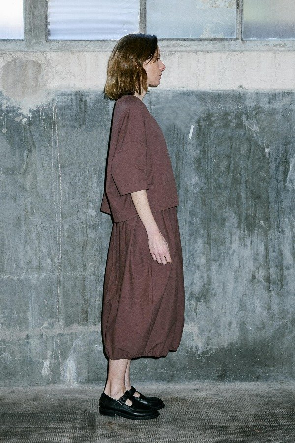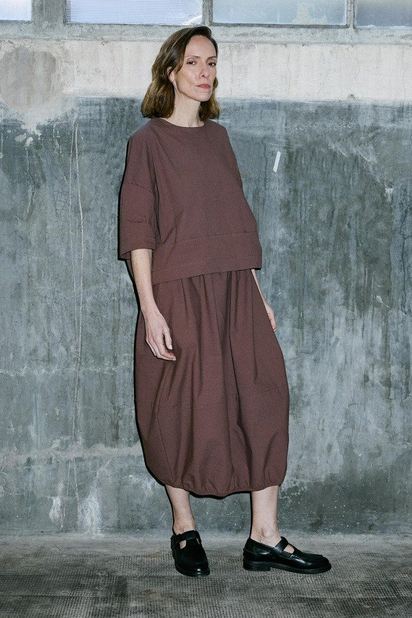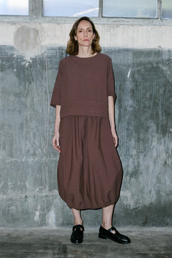 Blusa bombé mangas corta, botones en espalda de pasta al tono, corte parte inferior.