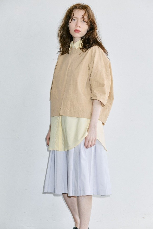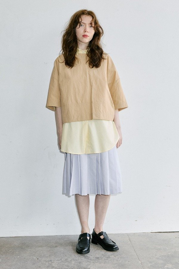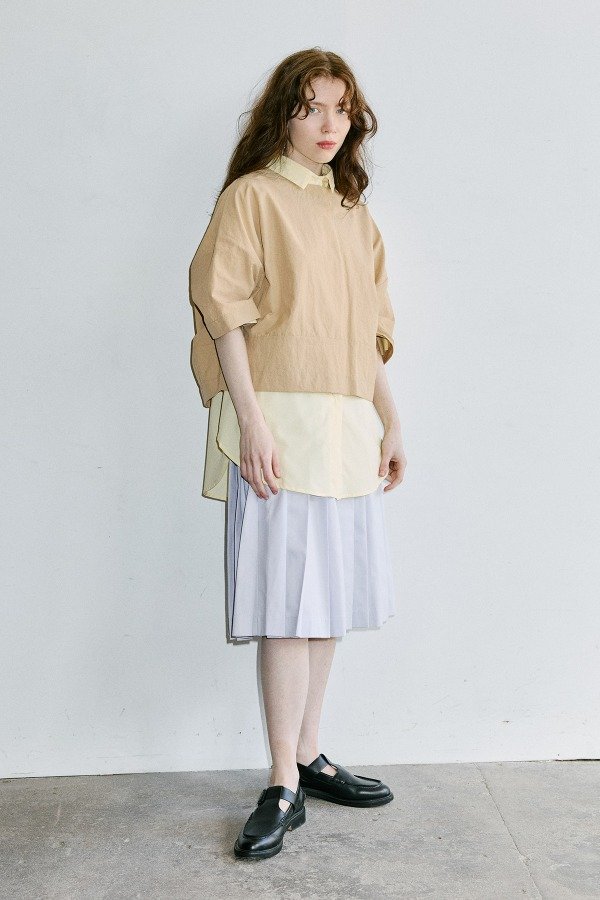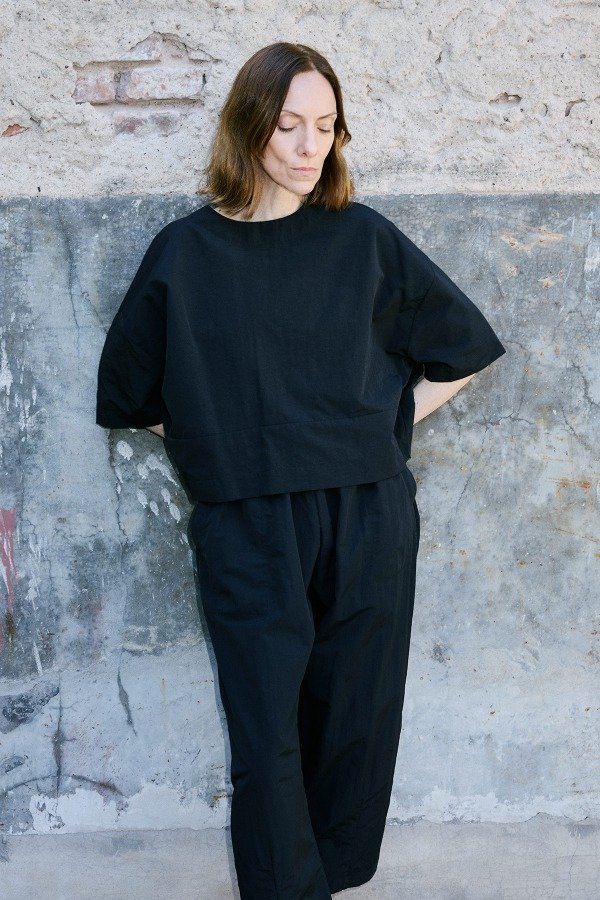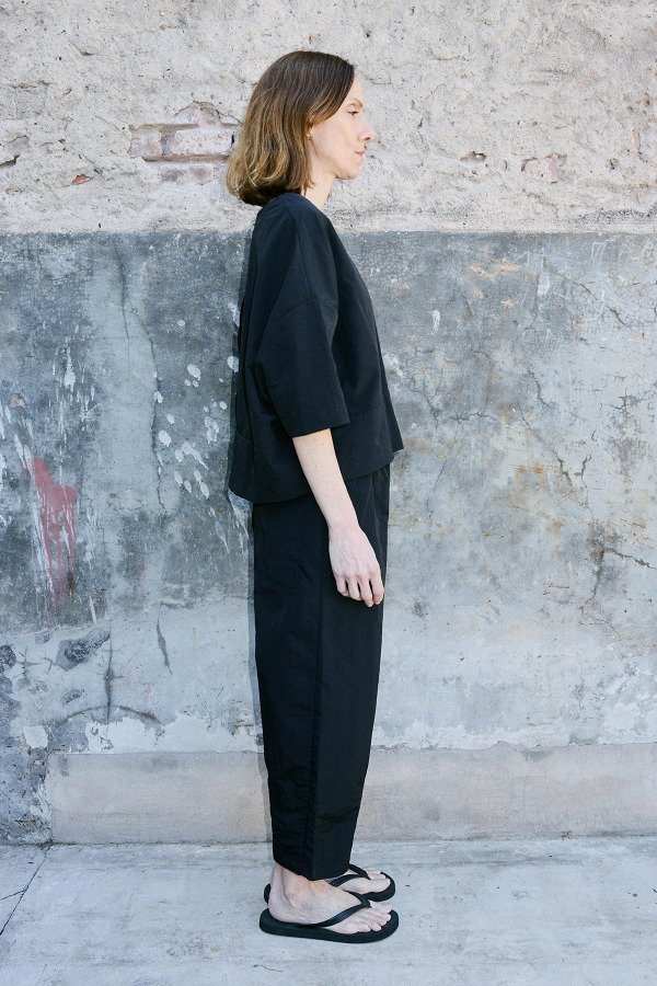 Blusa bombé mangas corta, botones en espalda de pasta al tono, corte parte inferior.