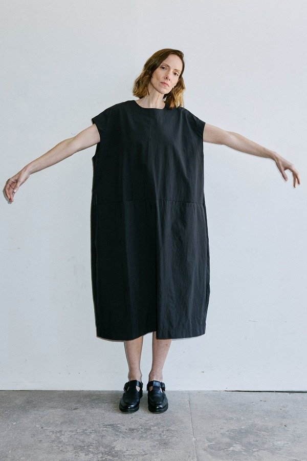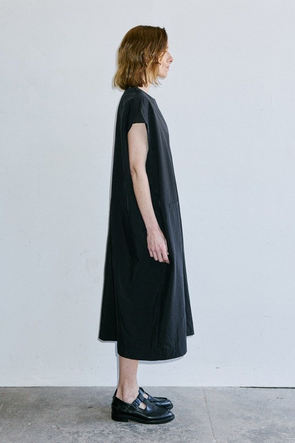 Vestido Bombé corte bajo sin mangas, bolsillos ojal frontales sobre corte vestido,